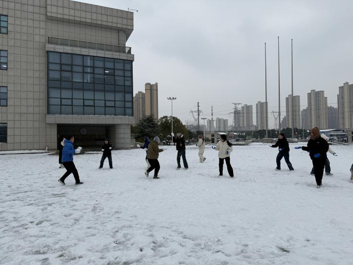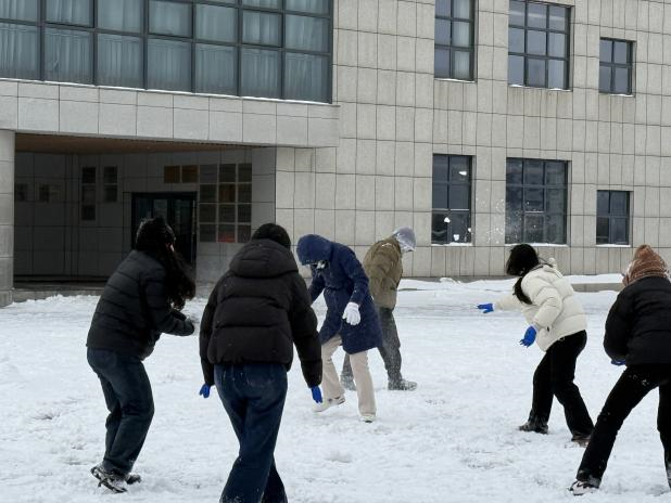 活动伊始,大家还略带矜持,欣赏着树梢与屋脊上累积的素白。不知是谁率先揉起一个雪球,“战幕”旋即拉开,雪球在空中划出一道道弧线,笑声、惊呼声、欢呼声此起彼伏。活动中,平日严谨认真的导师们与充满活力的学生们“战”成一团。大家分组协作,或团雪球精准“投掷”,或巧妙躲避,或“谋划”进攻,场面热烈而欢快。寒风吹不散高涨的热情,冰雪映衬着张张笑脸。