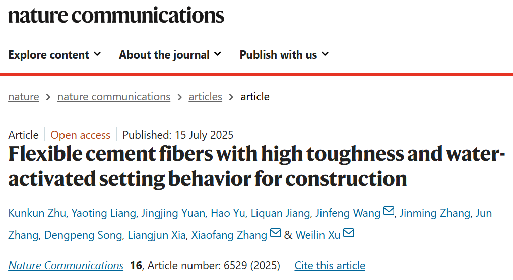 7月15日,纺织新材料与先进加工全国重点实验室徐卫林院士团队在Nature Communications期刊发表题为“Flexible cement fibers with high toughness and water-activated setting behavior for construction”的研究论文,论文第一作者为朱坤坤副教授,通讯作者为徐卫林院士、王金凤教授和张晓芳教授。该工作将传统水泥纤维化,该水泥纤维遇水前柔软可编织,遇水后固化可定型。与纯水泥板相比,水泥纤维织物的弯曲韧性提高了20倍。这种水泥纤维织物有望解决传统水泥韧性差易开裂的弊端,为特殊环境下的水泥应用提供了新方向。论文连接:https://doi.org/10.1038/s41467-025-61855-2