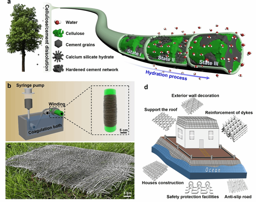 该工作提出了一种通过湿法纺丝技术实现大规模纤维素基水泥纤维制备的简便方法,该工艺使水泥在纤维素基质中原位嵌入。经水化处理后获得的纤维形成具有互穿双网络结构的水泥基复合材料,其由硬化结构与连续纤维素网络相互连接构成,界面结合紧密。所得水化纤维织物展现出优异的韧性与抗冲击性能,超越了大多数水泥基复合材料。更重要的是,这种水泥基纤维通过简单的水化固化工艺即可加工制造,可编织成具有复杂三维结构的多样化水泥基织物。此外,这类水泥基织物兼具优异性能:韧性良好、强度高、重量轻、隔热性强、防水性好,且适合大规模生产,因此在建筑工程、艺术创作、水利工程、土木工程及装饰工程等领域具有广阔应用前景。